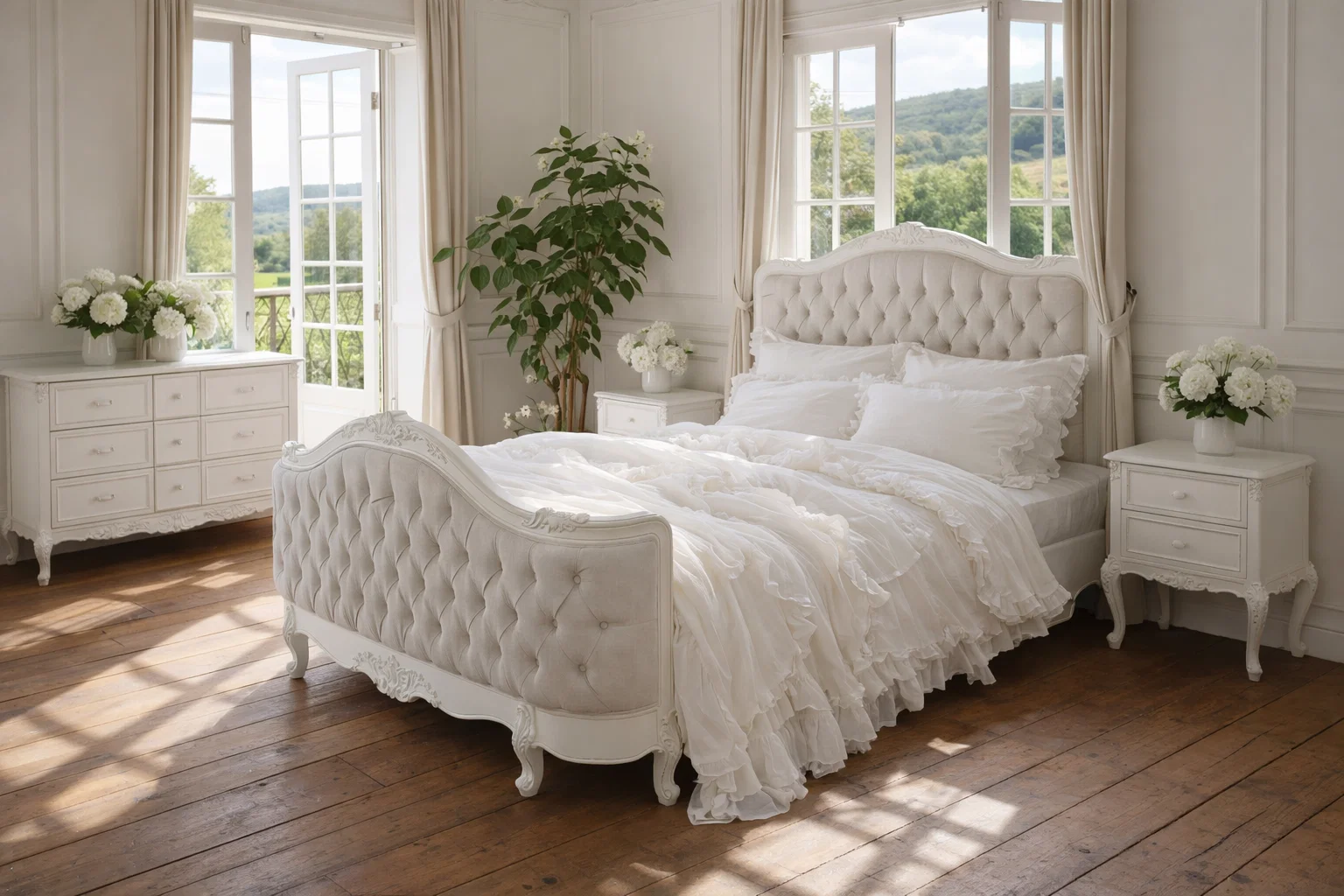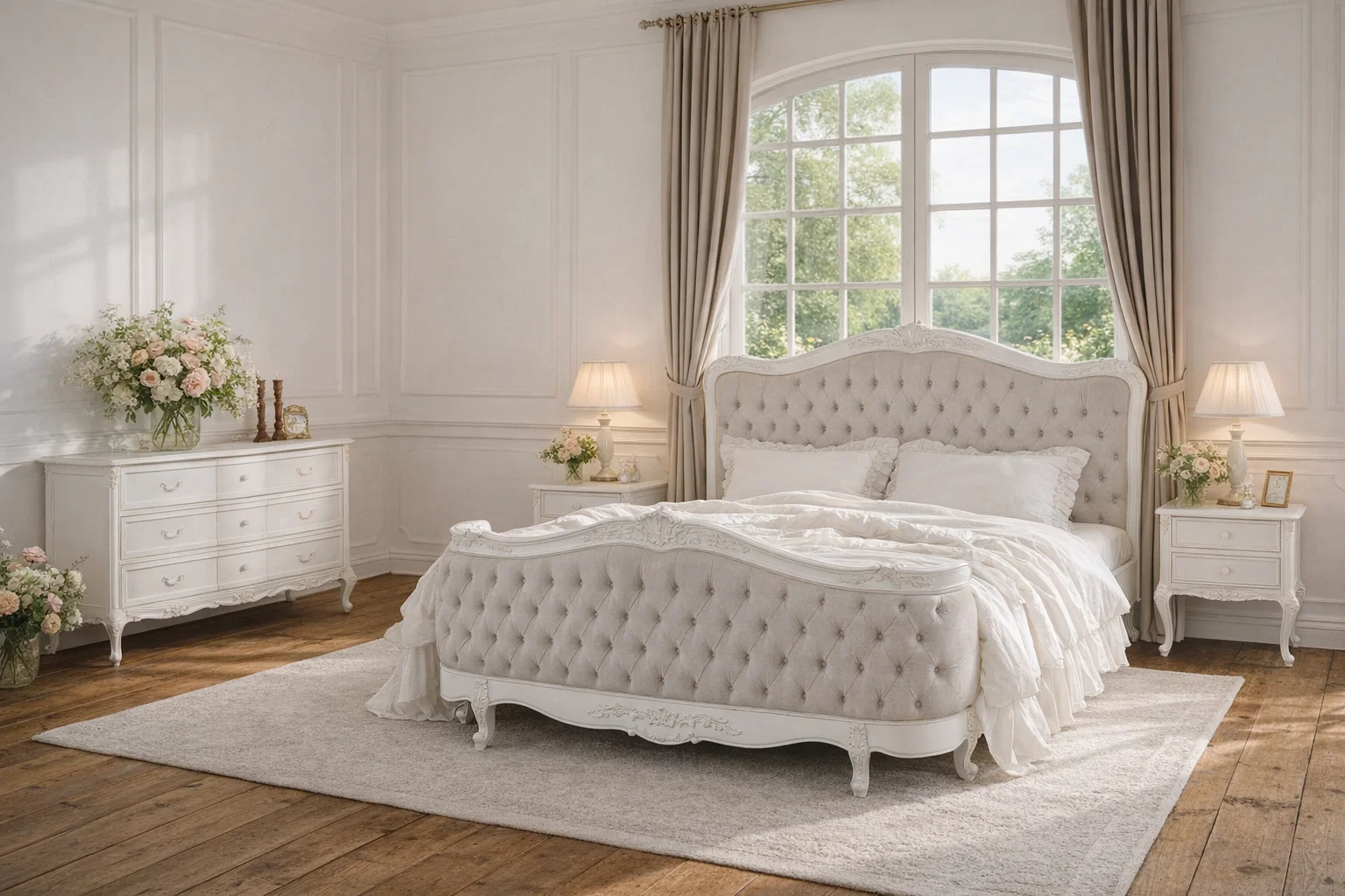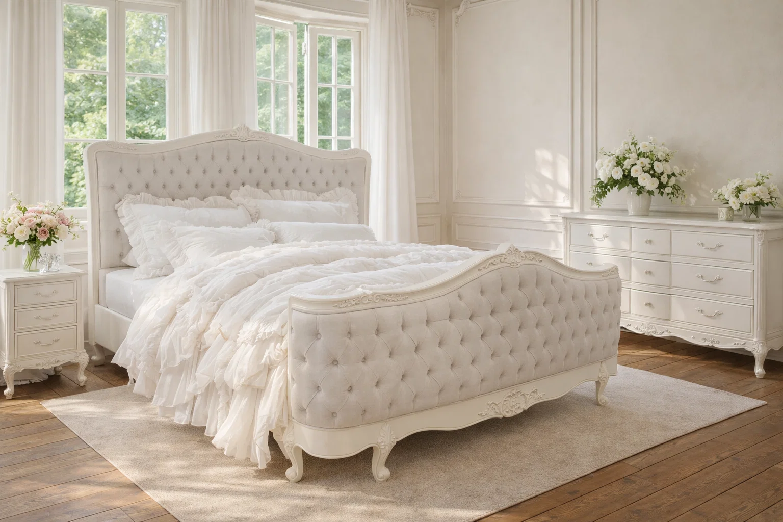 The Alice Farmhouse Tufted Antique White French Bed combines traditional elegance with rustic charm, offering a perfect blend of style and comfort. The bed features an intricately carved antique white wooden frame that complements the soft, neutral tufted linen upholstery. The deep button tufting on both the headboard and footboard adds texture and a classic touch, elevating the overall design. The bed’s refined curves and floral detailing at the base reflect the timeless appeal of French provincial style. Its sturdy wooden slats provide optimal support, making it a luxurious and functional centrepiece for any bedroom. Perfect for creating a sophisticated yet cozy atmosphere, this bed exudes charm and elegance.