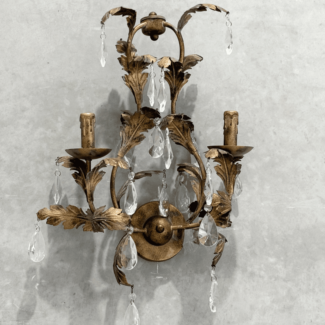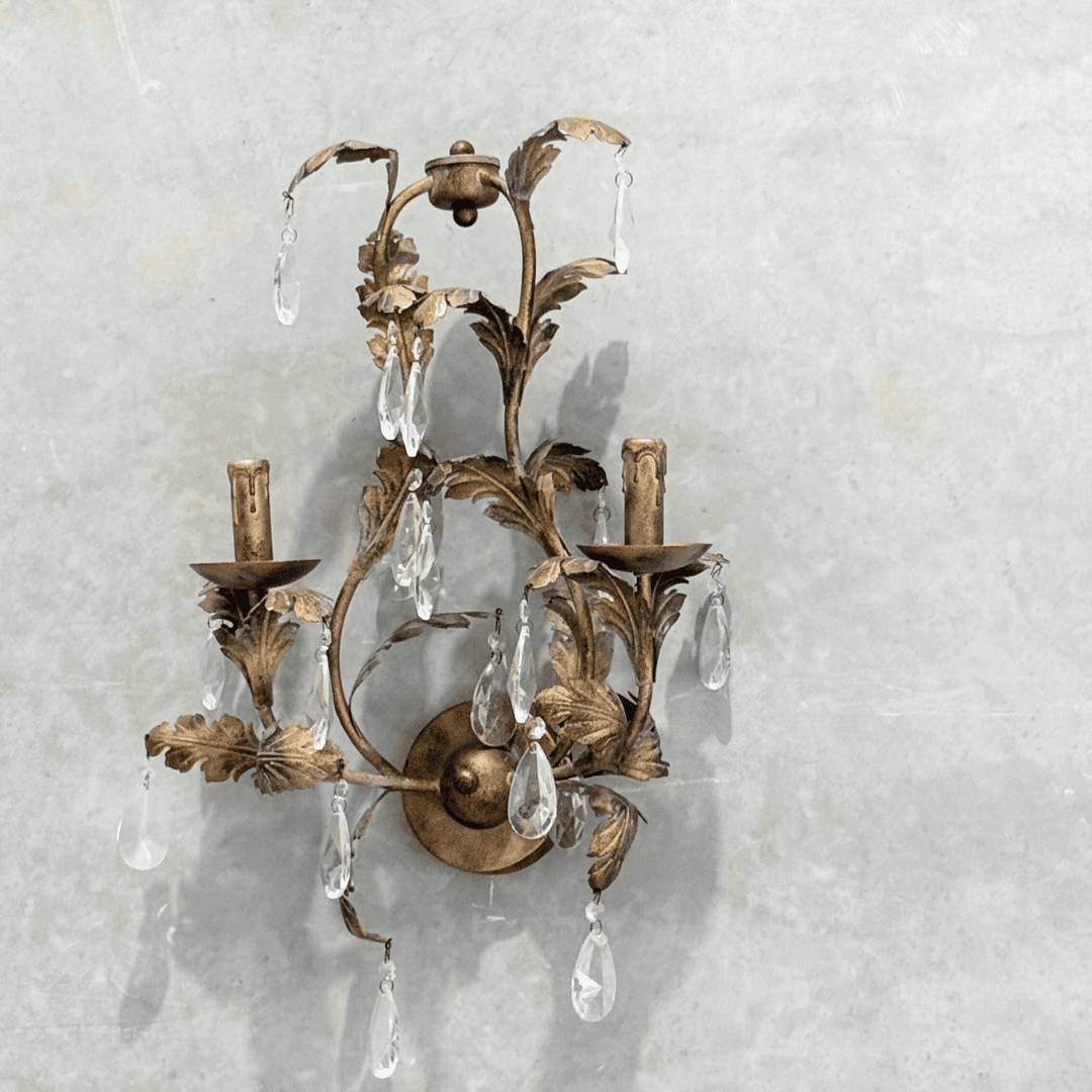 Elevate your décor with this antique gold leaf wall sconce, adorned with delicate crystal drops for an added touch of sophistication. The ornate leaf design, paired with a vintage-inspired finish, brings timeless elegance to any space. Ideal for creating a warm, ambient glow, this sconce is perfect for classic, French-inspired, or traditional interiors. Whether in a hallway, living room, or bedroom, this piece adds charm and refinement to your home.