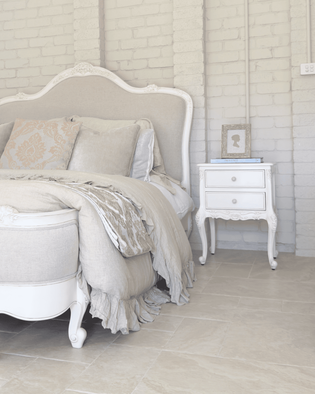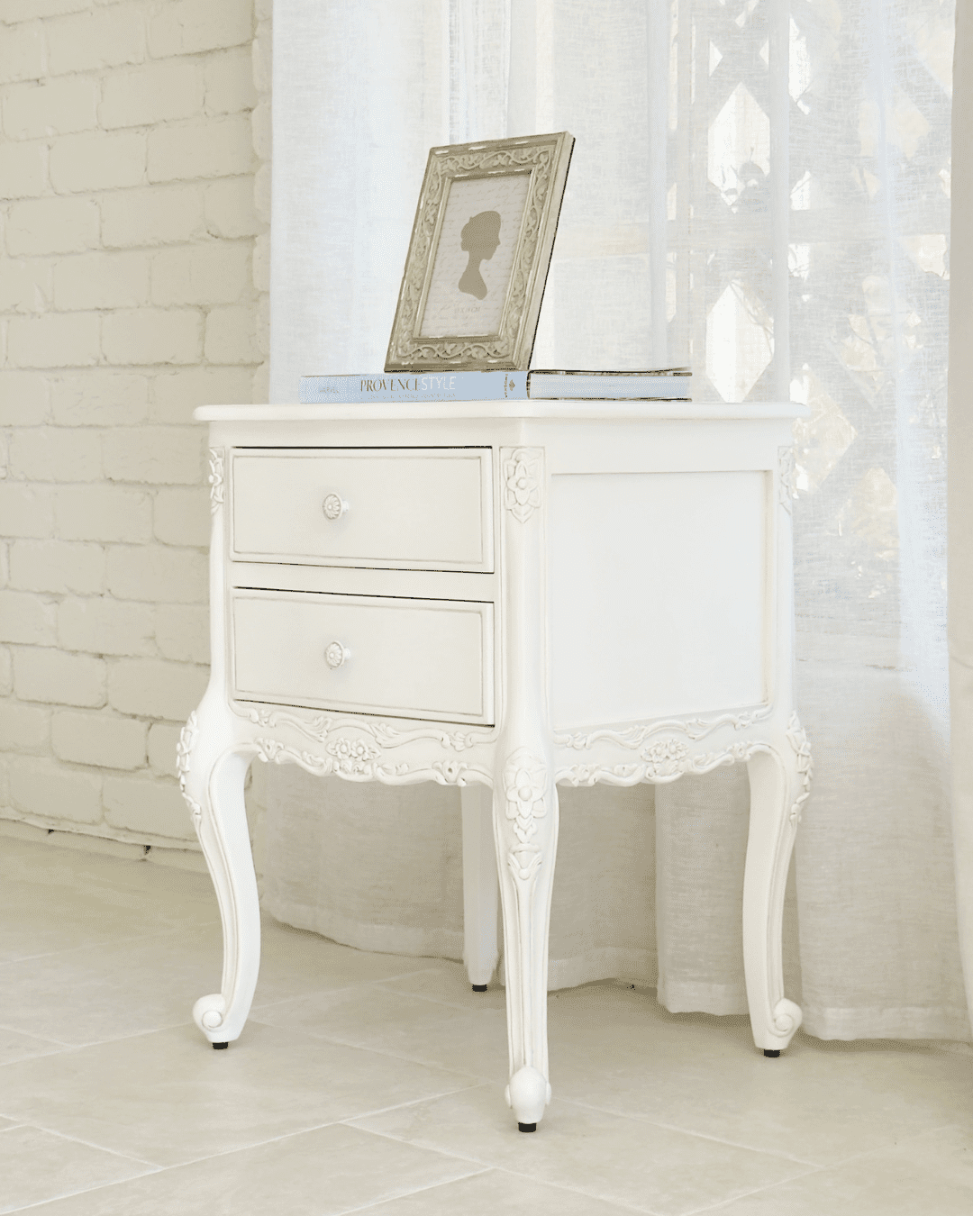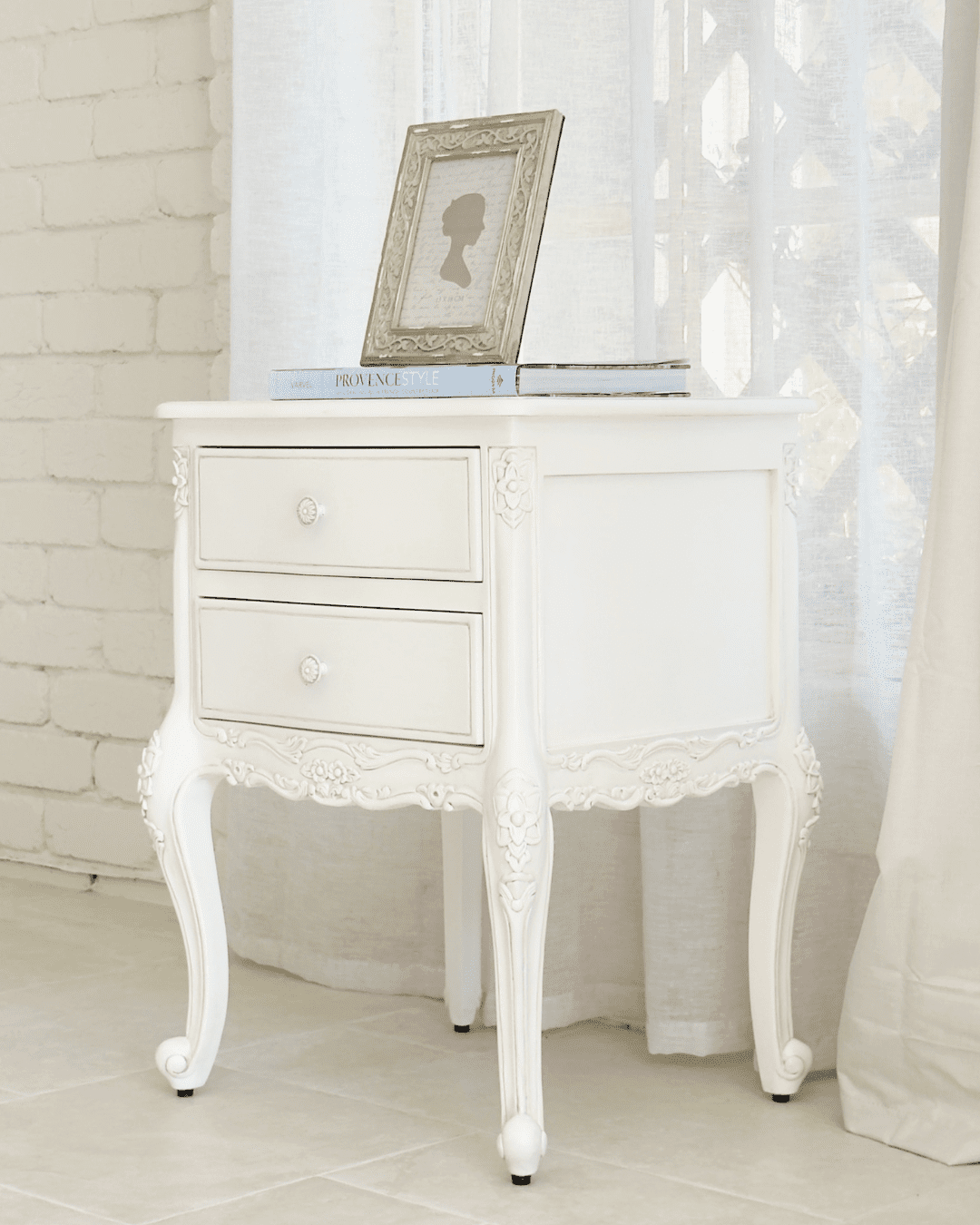 This Antonietta Antique White Bedside Table is a beautiful piece that brings classic French elegance to any bedroom. Crafted from high-quality wood, the rich antique white finish enhances its vintage charm. The table features two spacious drawers with intricate carved details on the front and elegantly designed brushed white handles, adding a touch of sophistication. The curved legs and floral carvings along the base showcase the fine craftsmanship typical of French provincial furniture. Perfect for storing essentials while adding an elegant, timeless appeal to your space, this bedside table is ideal for completing a classic French country or vintage-inspired bedroom.