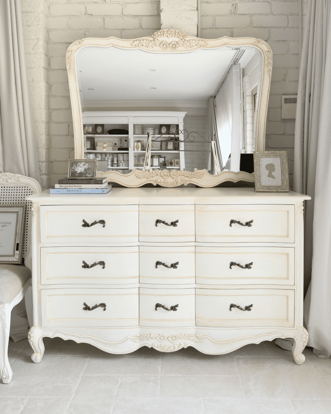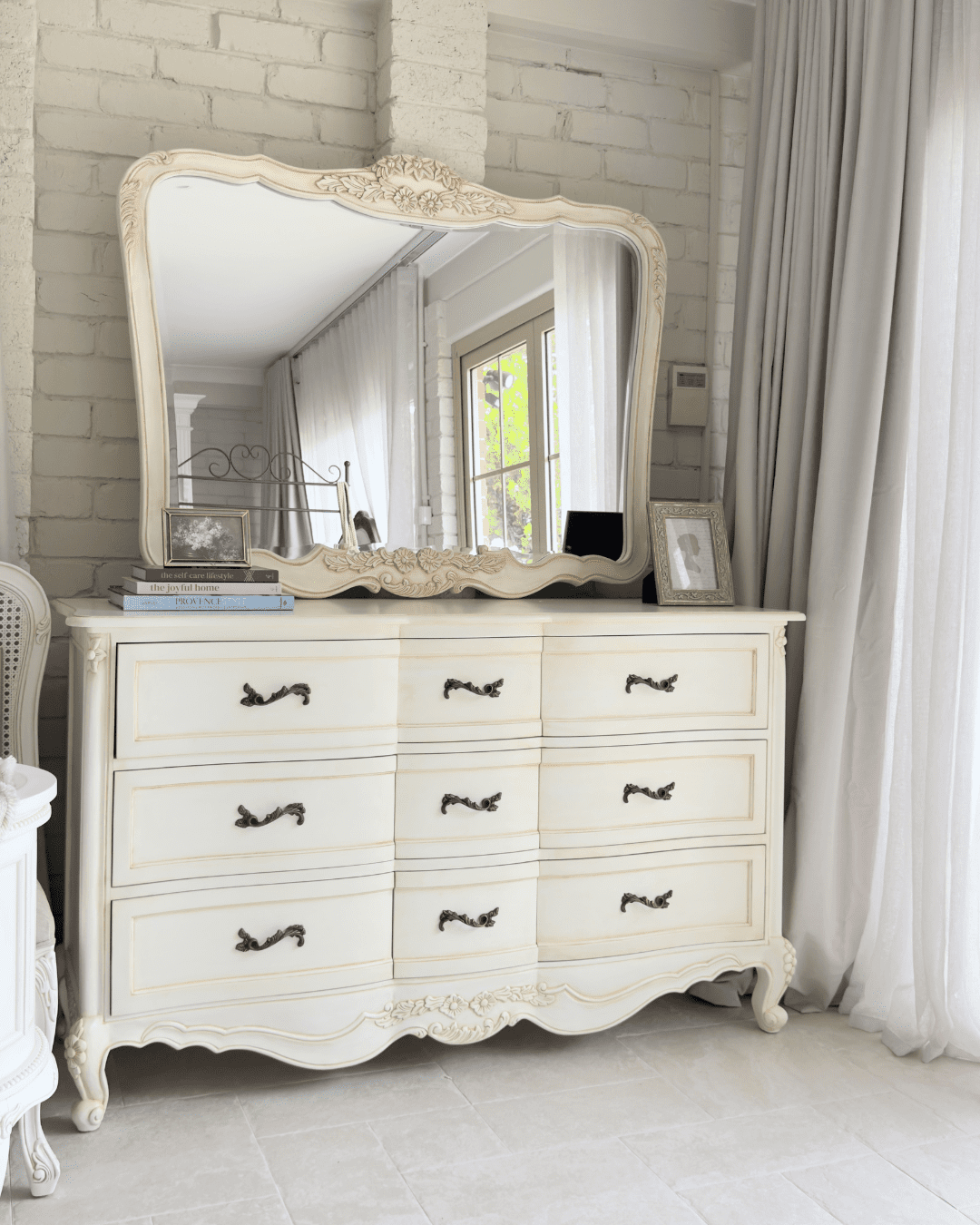 Belle Antique White French Bedroom Suite brings a classic French look to your space. The set includes a carved dresser with a matching mirror, and detailed bedside tables. The antique white finish gives a warm aged tone. The floral carvings, curved legs, and shaped frames highlight fine French provincial style. The drawers give smooth storage. This suite lifts your bedroom with calm tones and refined detailing.