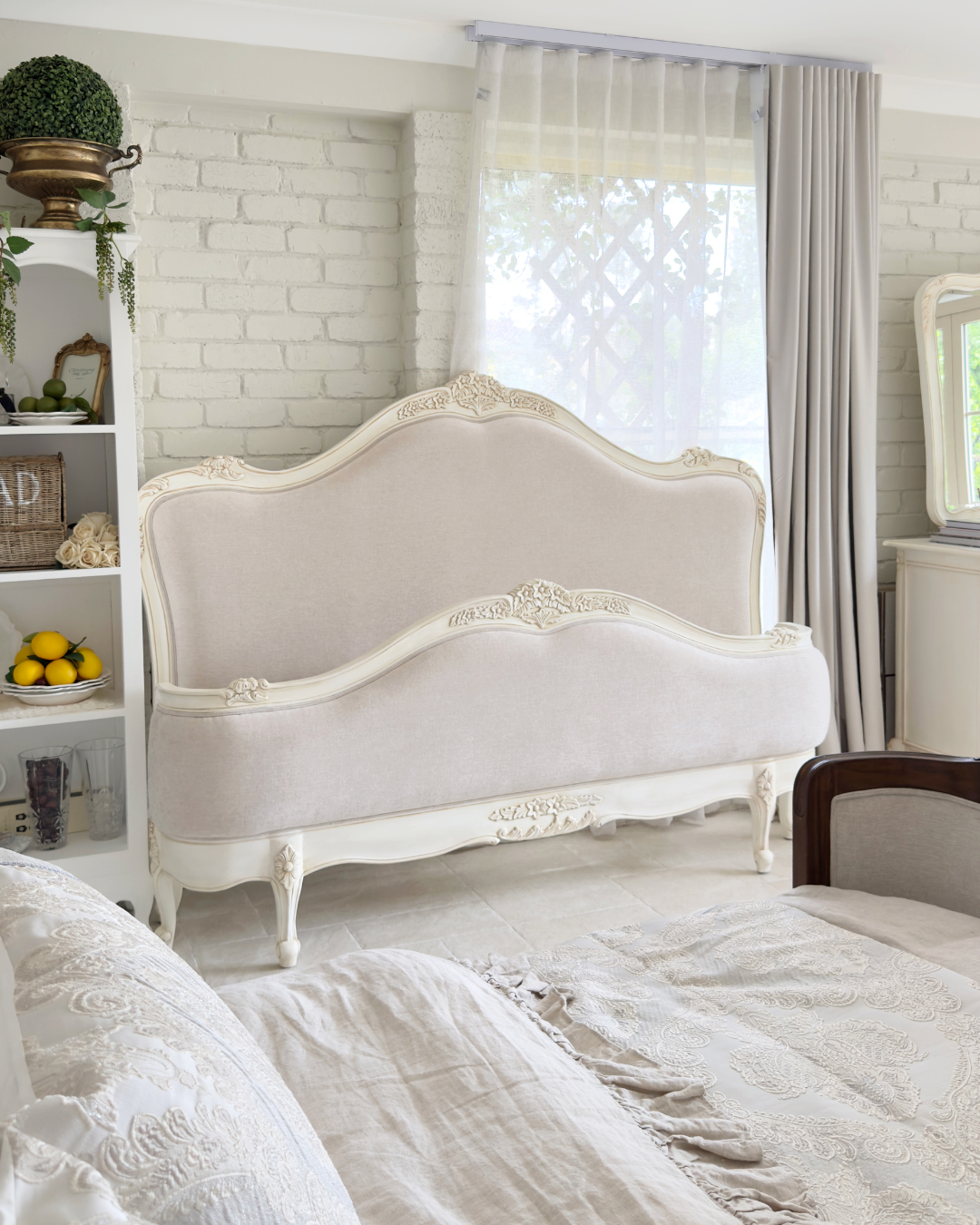 Belle Antique White French Bedroom Suite brings a classic French look to your space. The set includes a carved dresser with a matching mirror, a soft upholstered bed, and a detailed bedside table. The antique white finish gives a warm aged tone. The floral carvings, curved legs, and shaped frames highlight fine French provincial style. The drawers give smooth storage. The bed offers soft fabric panels and a carved frame. This suite lifts your bedroom with calm tones and refined detailing.