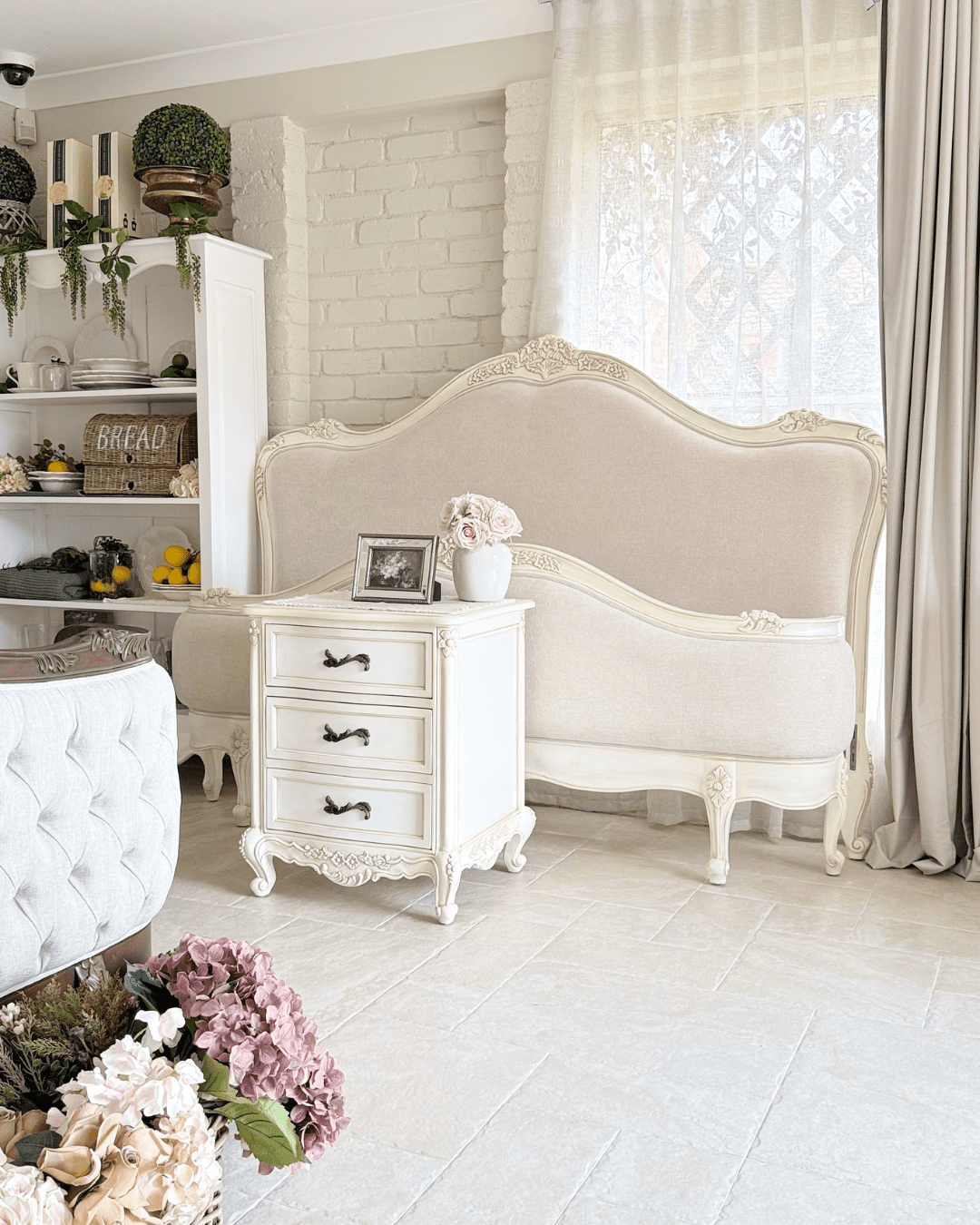 Belle Antique White French Bedside Table brings a soft timeless look to your room. The carved floral base, curved legs, and antique white finish give a warm vintage feel. The drawers store night time essentials with ease. The ornate handles add charm and fine detailing. This bedside table completes any French provincial bedroom with quiet elegance.