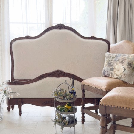 Crafted with exquisite attention to detail, the Juliette Bed features a gracefully curved silhouette, ornate hand-carved accents, and warm antique brown finish that evokes vintage sophistication. The upholstered bedhead and footer are wrapped in a warm neutral linen, adding a touch of comfort and understated luxury. Gently scalloped edges and classic cabriole legs complete the design, making this piece a refined centrepiece for any bedroom. Perfect for those who love traditional French décor with a soft, feminine touch.