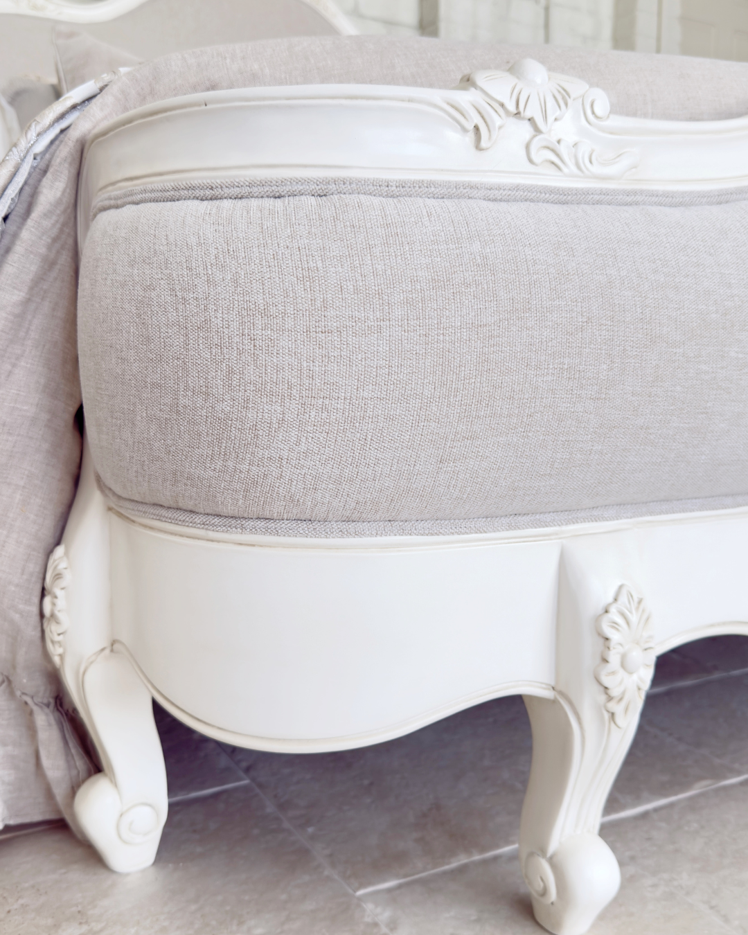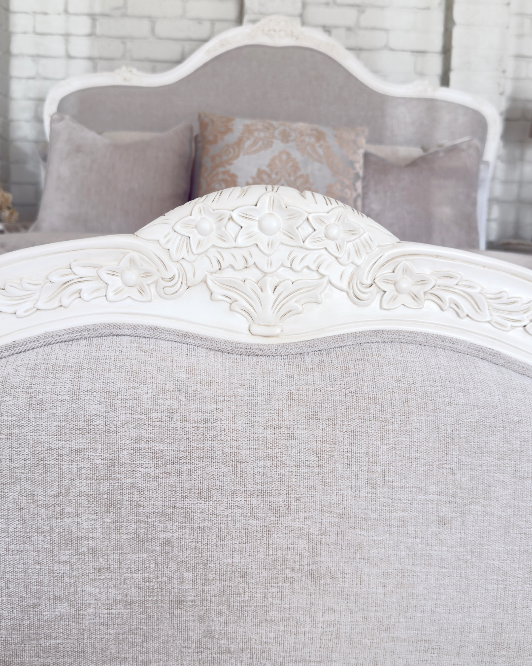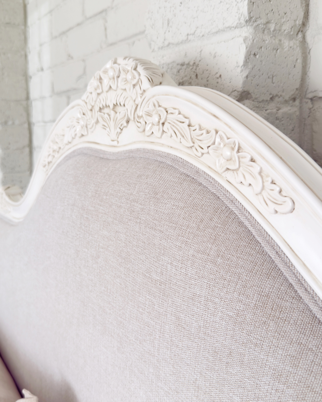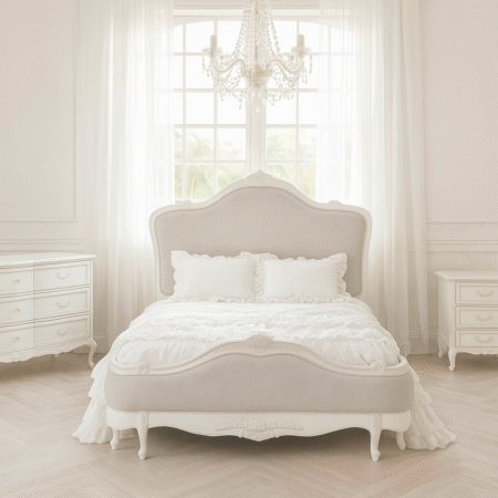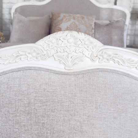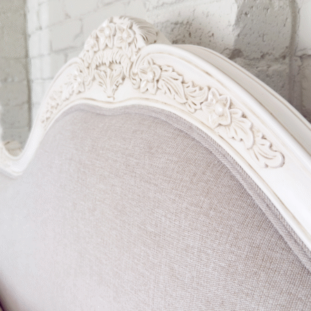 Crafted with exquisite attention to detail, the Juliette Bed features a gracefully curved silhouette, ornate hand-carved accents, and a soft antique white finish that evokes vintage sophistication. The upholstered bedhead and footer are wrapped in a warm neutral linen, adding a touch of comfort and understated luxury. Gently scalloped edges and classic cabriole legs complete the design, making this piece a refined centrepiece for any bedroom. Perfect for those who love traditional French décor with a soft, feminine touch.