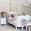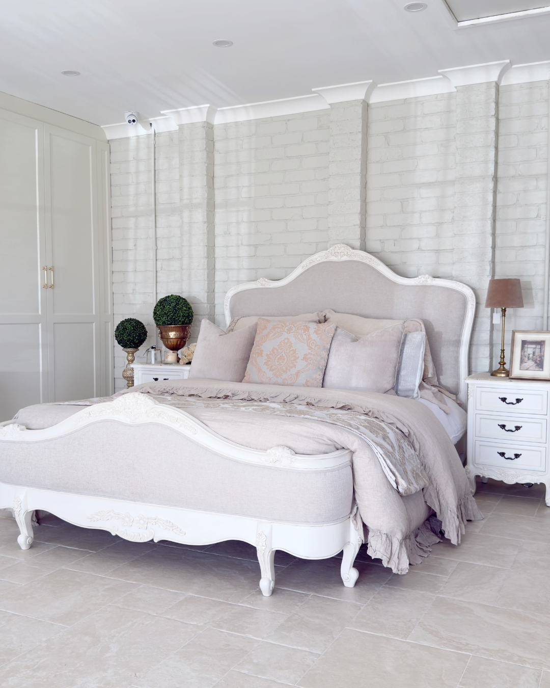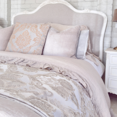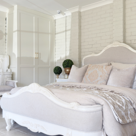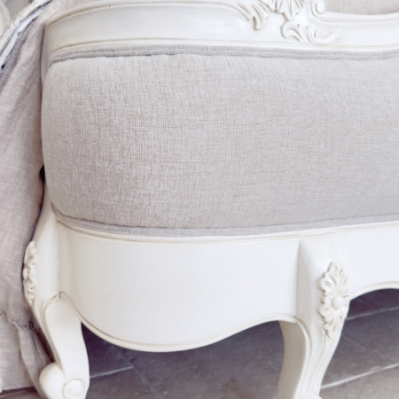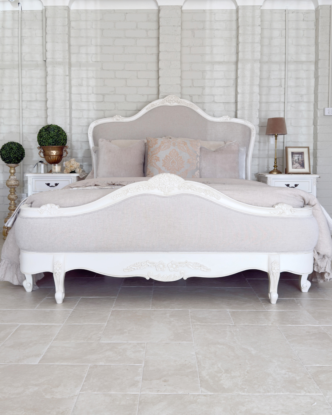 Crafted with exquisite attention to detail, the Juliette Bed features a gracefully curved silhouette, ornate hand-carved accents, and a soft antique white finish that evokes vintage sophistication. The upholstered bedhead and footer are wrapped in a warm neutral linen, adding a touch of comfort and understated luxury. Gently scalloped edges and classic cabriole legs complete the design, making this piece a refined centrepiece for any bedroom. Perfect for those who love traditional French décor with a soft, feminine touch.
