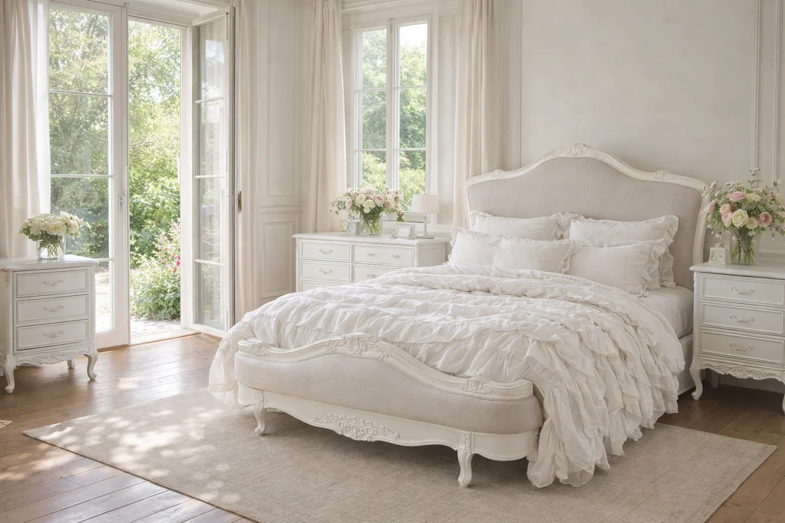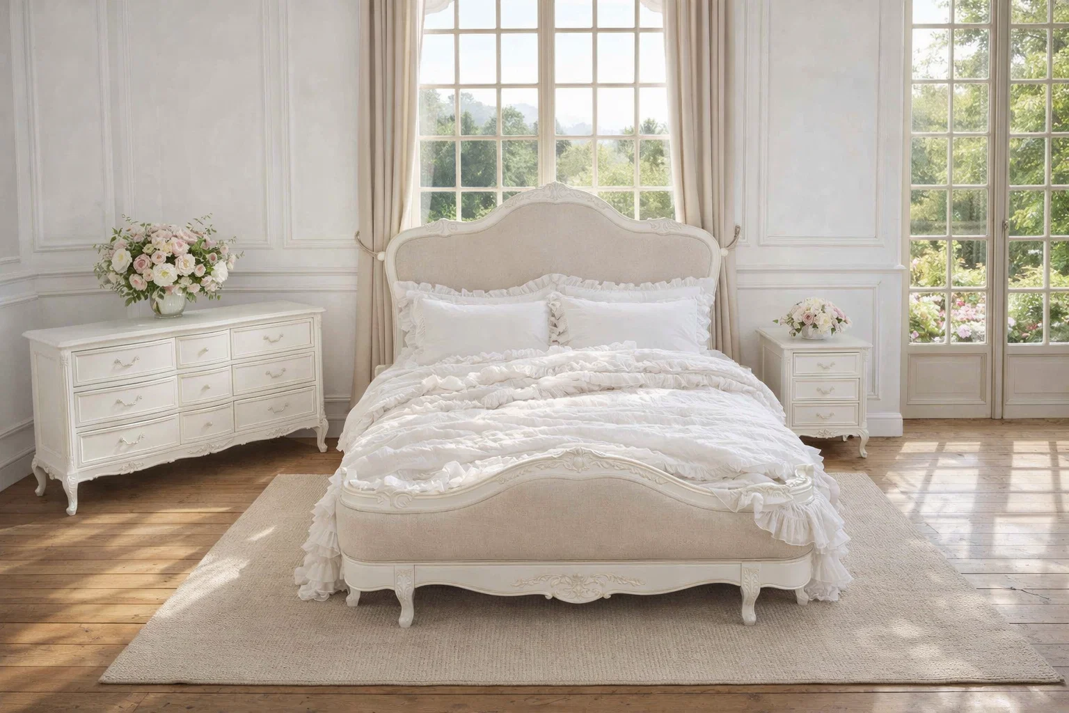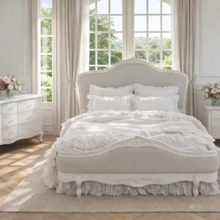 Crafted with exquisite attention to detail, the Juliette Bed features a gracefully curved silhouette, ornate hand-carved accents, and a soft antique white finish that evokes vintage sophistication. The upholstered bedhead and footer are wrapped in a warm neutral linen, adding a touch of comfort and understated luxury. Gently scalloped edges and classic cabriole legs complete the design, making this piece a refined centrepiece for any bedroom. Perfect for those who love traditional French décor with a soft, feminine touch.